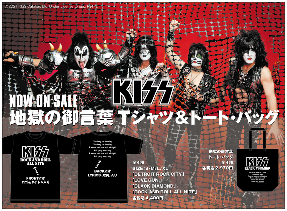 KISSの「地獄の御言葉」が刻まれたTシャツ、トート・バッグは大好評発売中。彼らの名曲4曲から歌詞を引用した各4パターンは、ロゴと歌詞のみのシンプルな仕様。