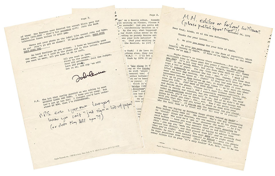 ビートルズ解散後の1971年11月、ジョン・レノンがポール・マッカートニーに送った辛辣な手紙が、オークション・サイト「Gotta Have Rock and Roll」により、オンライン・オークションに出品されました。
